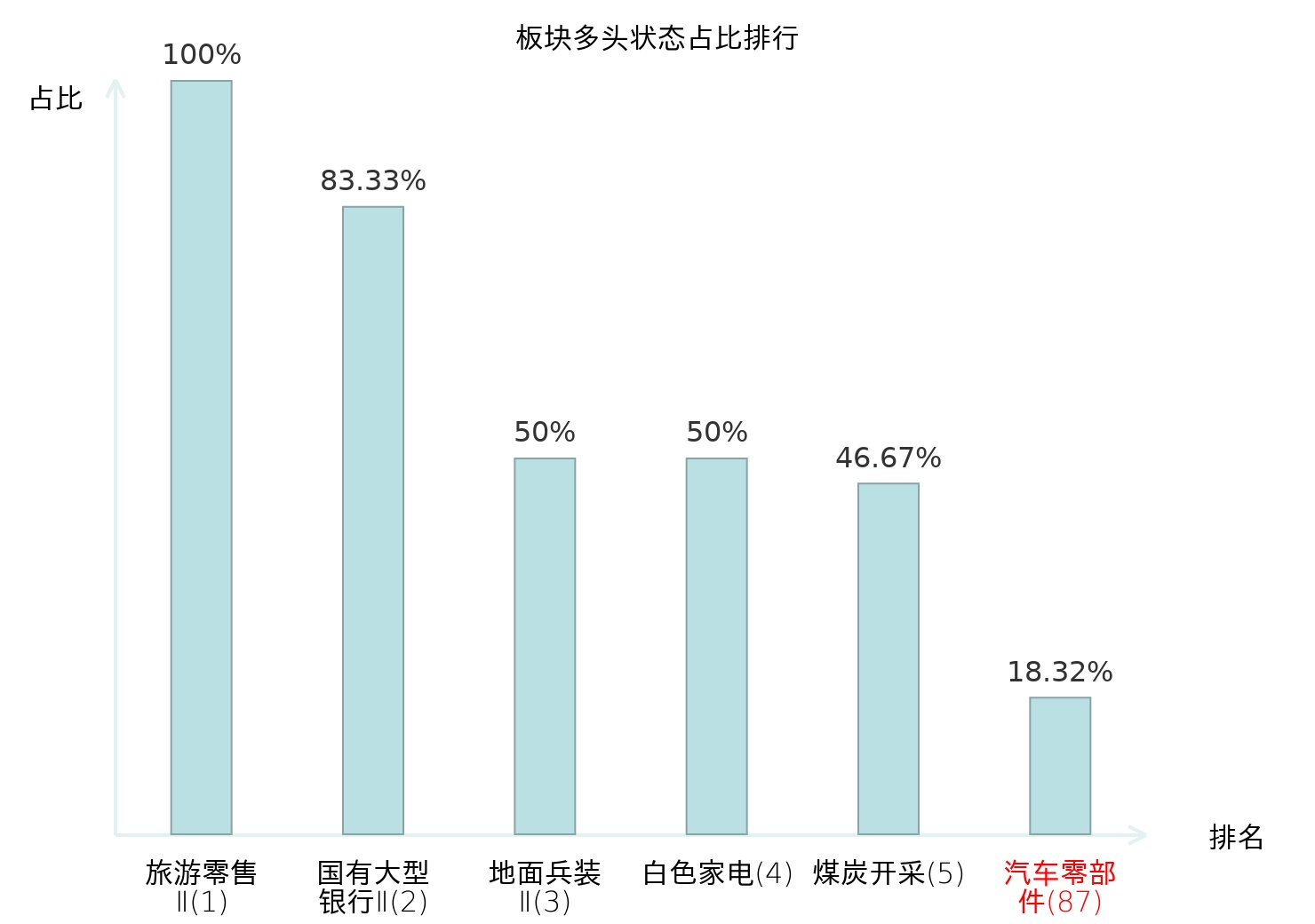 全市场所有行业板块中主力多头状态占比排名中,旅游零售Ⅱ板块位居第一。油服工程板块名次提升最快,较昨日上升107位。
