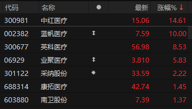 上证报中国证券网讯 3月13日早盘,A股医疗耗材概念局部活跃。9时48分,中红医疗涨超14%,蓝帆医疗涨停,英科医疗涨超8%,业聚医疗、采纳股份跟涨。
