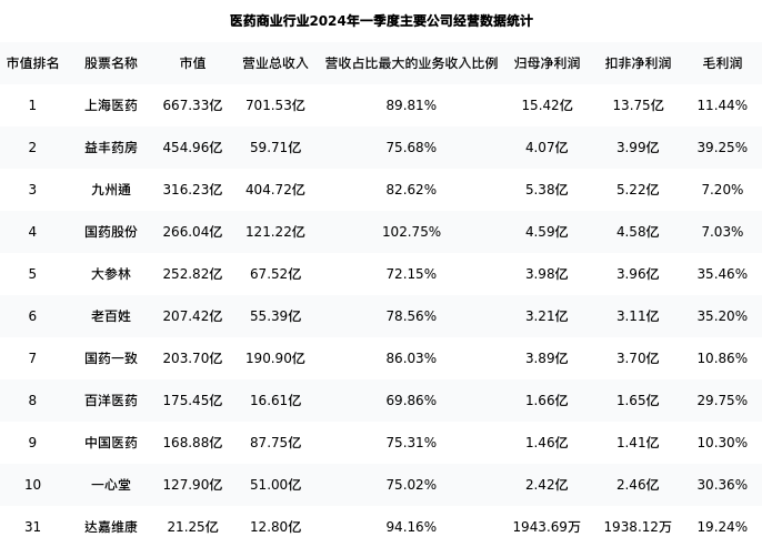 达嘉维康最新报告期数据为一季度,下表汇总了医药商业行业内市值靠前的公司一季度主要经营数据