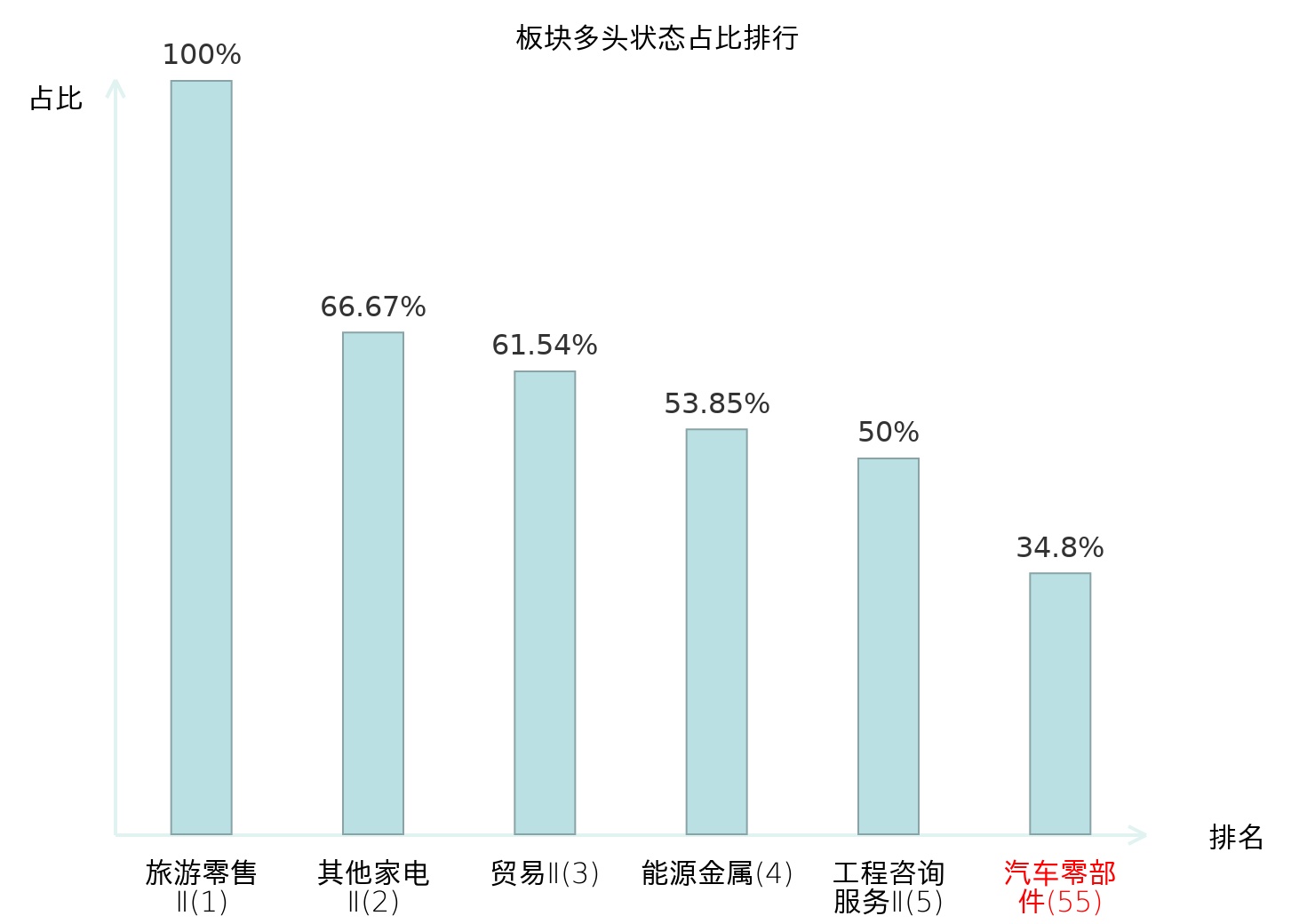 全市场所有行业板块中主力多头状态占比排名中,旅游零售Ⅱ板块位居第一。冶钢原料板块名次提升最快,较昨日上升37位。