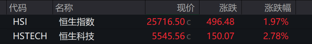 港股:截至发稿,恒生指数收盘涨1.97%,恒生科技指数涨2.78%。