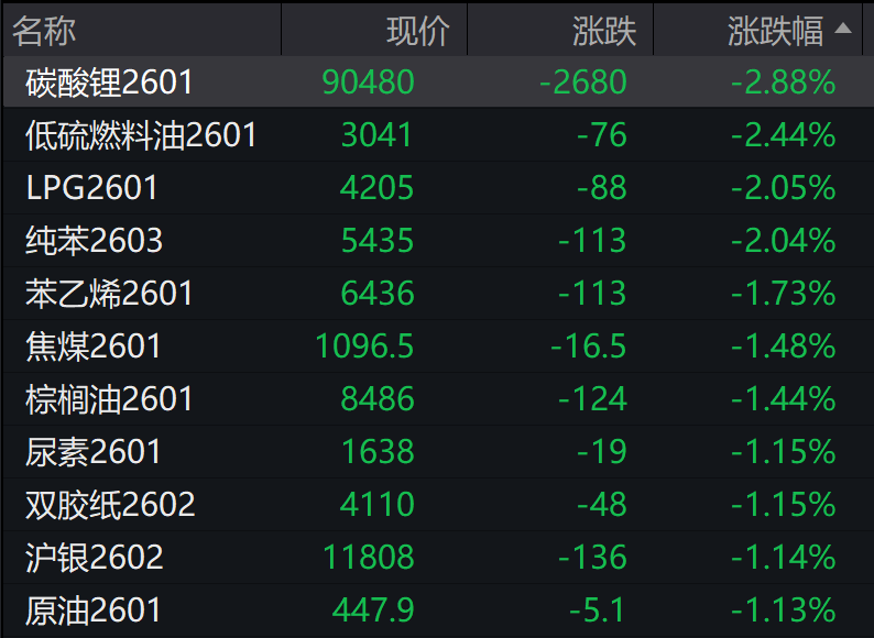 商品涨跌参半,碳酸锂跌2.88%,沪银跌1.14%,集运指数(欧线)跌0.54%。