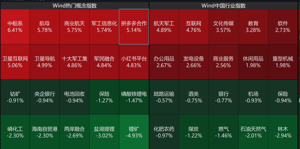 盘面上,个股涨多跌少,沪深京三市超4200股飘红,今日成交1.74万亿,较上个交易日缩量超2400亿。板块方面,军工相关概念全线爆发,中船系、航母、商业航天、军工信息化等板块强势领涨,拼多多合作、互联网、文化传媒等新经济题材表现活跃;下跌方面,锂矿、盐湖提锂等新能源资源板块集体调整,磷化工、化肥农药等农业相关板块同步走弱,煤炭、燃气、石油天然气等传统能源板块普遍承压。