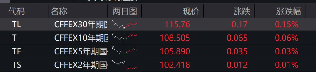 债市:债市全线上涨,30年期主力合约涨0.15%报115.760元,10年期主力合约涨0.06%报108.505元,5年期主力合约涨0.03%报105.890元,2年期主力合约涨0.01%报102.418元。