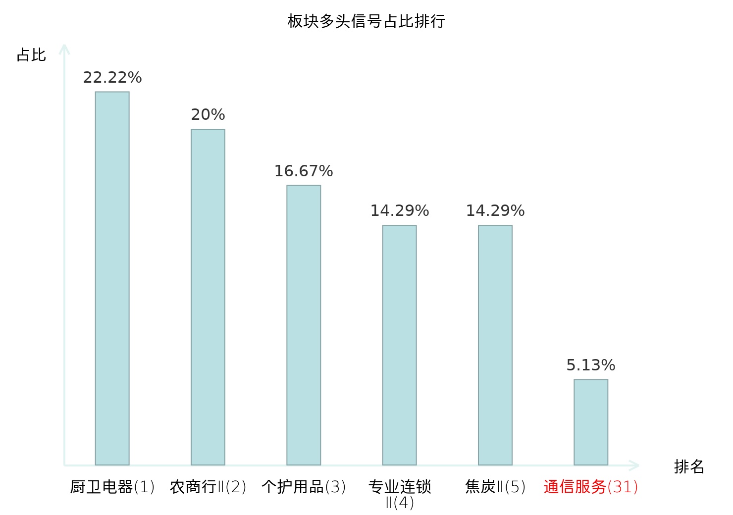 全市场所有行业板块中主力多头信号占比排名中,厨卫电器板块位居第一。专业连锁Ⅱ板块名次提升最快,较昨日上升117位。