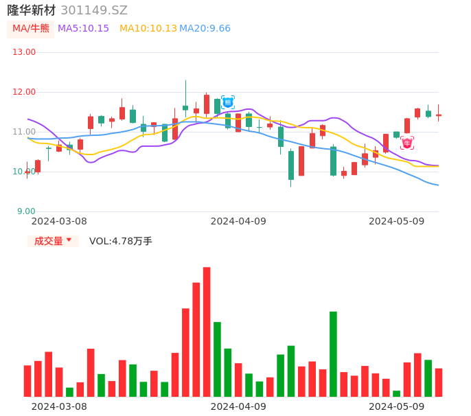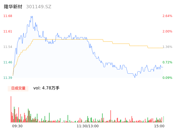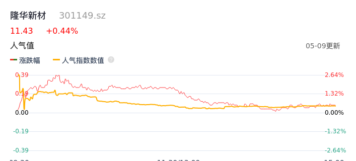 05月09日,隆华新材收报11.43,股价涨幅0.44%,成交金额5511.23万元,换手率2.58%。
