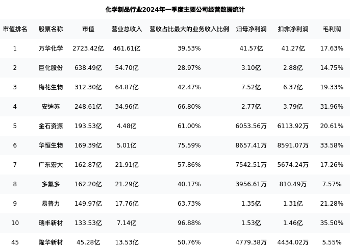 隆华新材最新报告期数据为一季度,下表汇总了化学制品行业内市值靠前的公司一季度主要经营数据