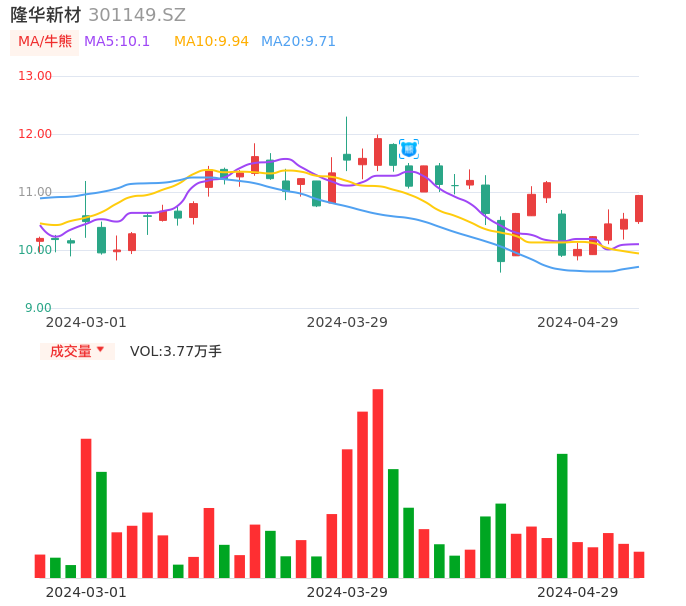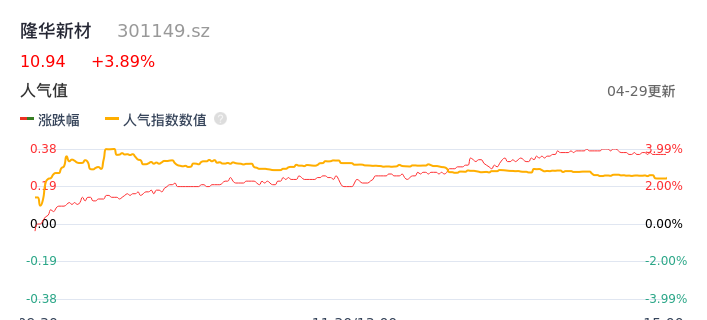04月29日,隆华新材收报10.94,股价涨幅3.89%,成交金额4064.41万元,换手率2.04%。