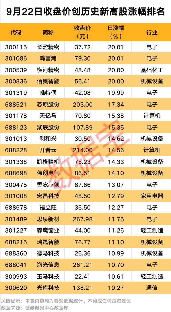 收盘价创历史新高股中,今日股价平均上涨7.27%,涨停的有长盈精密、鸿富瀚、横河精密等,涨幅居前的有芯原股份、天亿马、聚辰股份等。