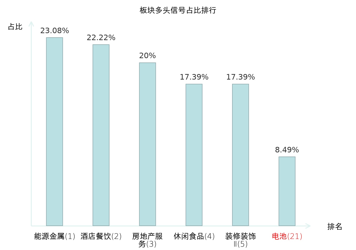 全市场所有行业板块中主力多头信号占比排名中,能源金属板块位居第一。渔业板块名次提升最快,较昨日上升116位。