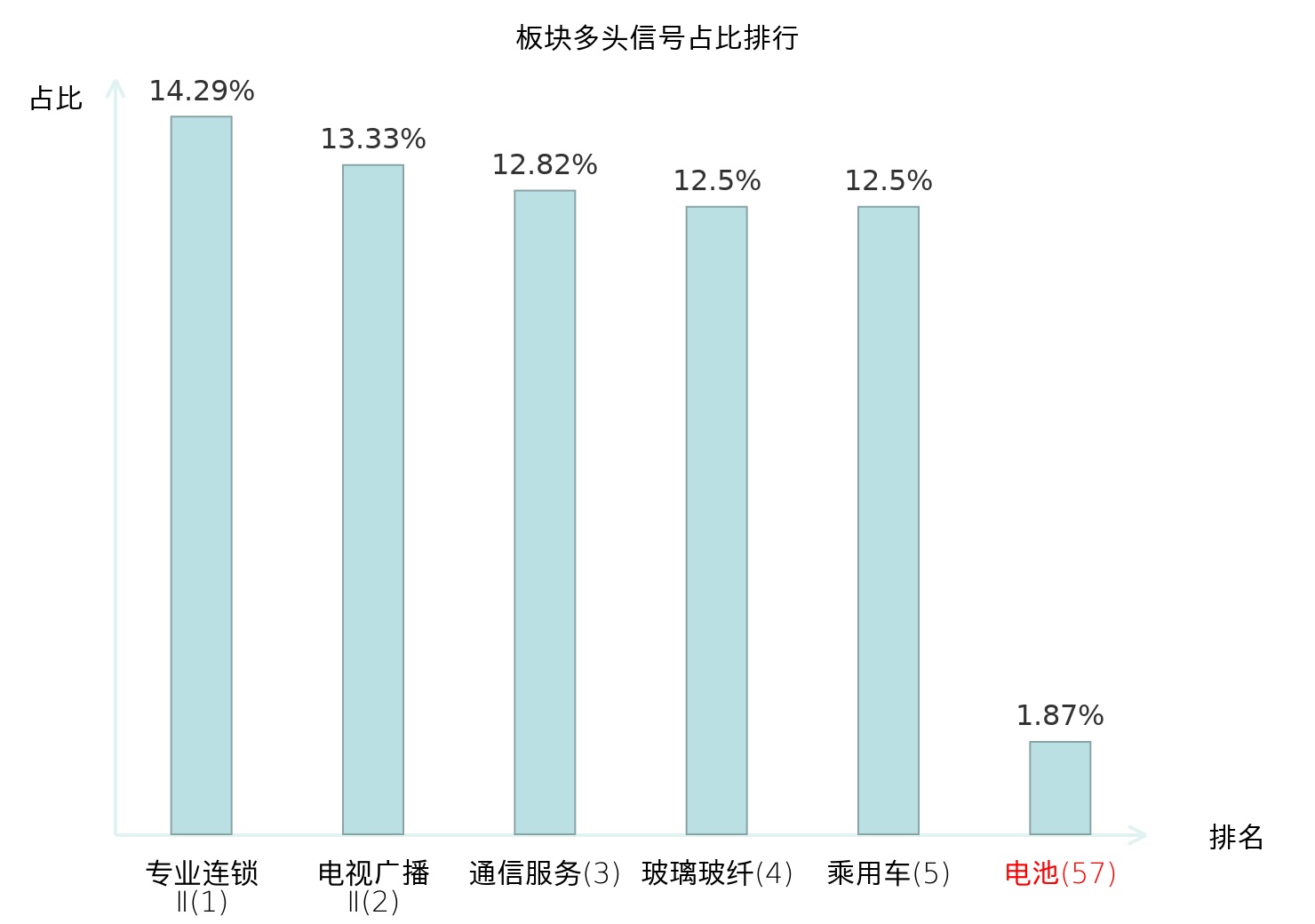 全市场所有行业板块中主力多头信号占比排名中,专业连锁Ⅱ板块位居第一。专业连锁Ⅱ板块名次提升最快,较昨日上升124位。