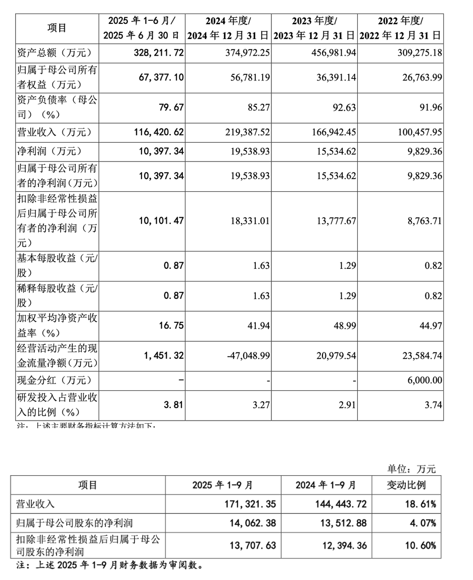 财务数据方面,2021年度至2024年度及2025年前三季度,泰金新能分别实现营收10.04亿元、16.69亿元、21.94亿元、17.13亿元;分别实现归母净利润9829.36万元、1.55亿元、1.95亿元、1.41亿元。
