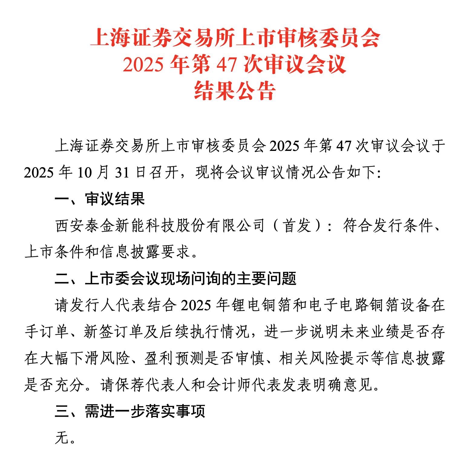 《科创板日报》10月31日讯(记者 黄修眉)上交所上市审核委员会今日(10月31日)审议通过了西安泰金新能科技股份有限公司(下称“泰金新能”)科创板IPO申请。泰金新能亦是新“国九条”发布以来,上交所受理的首家科创板IPO企业。
