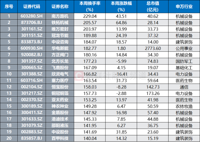 具体个股来看,南方路机以229%的周换手率规模位居第一,铁拓机械、唯万密封2股周换手率也双双超2倍,同时,冠龙节能、中设咨询、华电新能、方正阀门、北方长龙等股本周换手率规模也居前。此外,若仅统计千亿市值股,华电新能唯一换手率翻倍,北方稀土、包钢股份、中国电建、海螺水泥、同花顺等股本周交投活跃度也较高。
