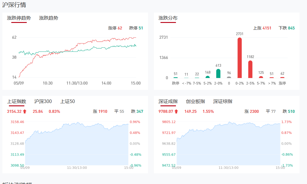市场全天震荡反弹,创业板指领涨,沪指、深成指均再创年内新高。截至收盘,沪指涨0.83%,深成指涨1.55%,创业板指涨1.87%。总体上个股涨多跌少,全市场超4200只个股上涨。沪深两市今日成交额9011亿,较上个交易日放量367亿。