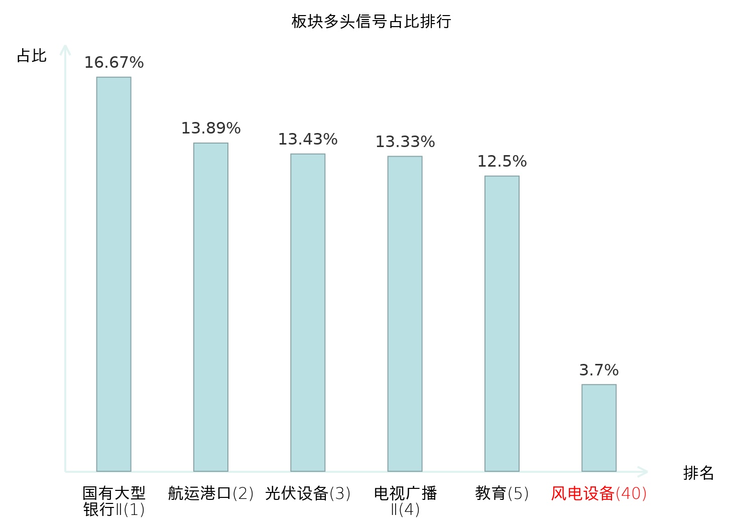 全市场所有行业板块中主力多头信号占比排名中,国有大型银行Ⅱ板块位居第一。国有大型银行Ⅱ板块名次提升最快,较昨日上升124位。