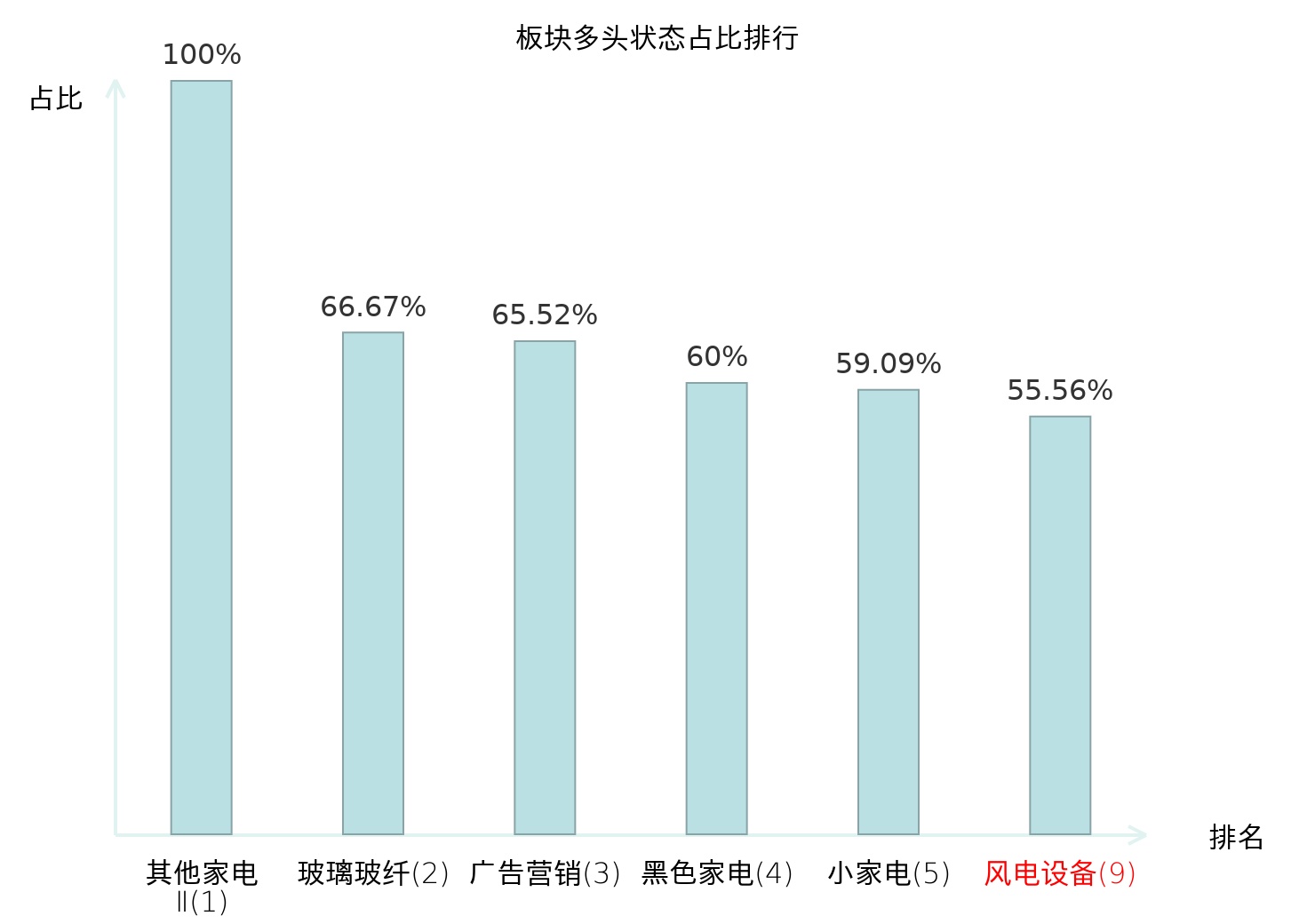 全市场所有行业板块中主力多头状态占比排名中,其他家电Ⅱ板块位居第一。航天装备Ⅱ板块名次提升最快,较昨日上升79位。