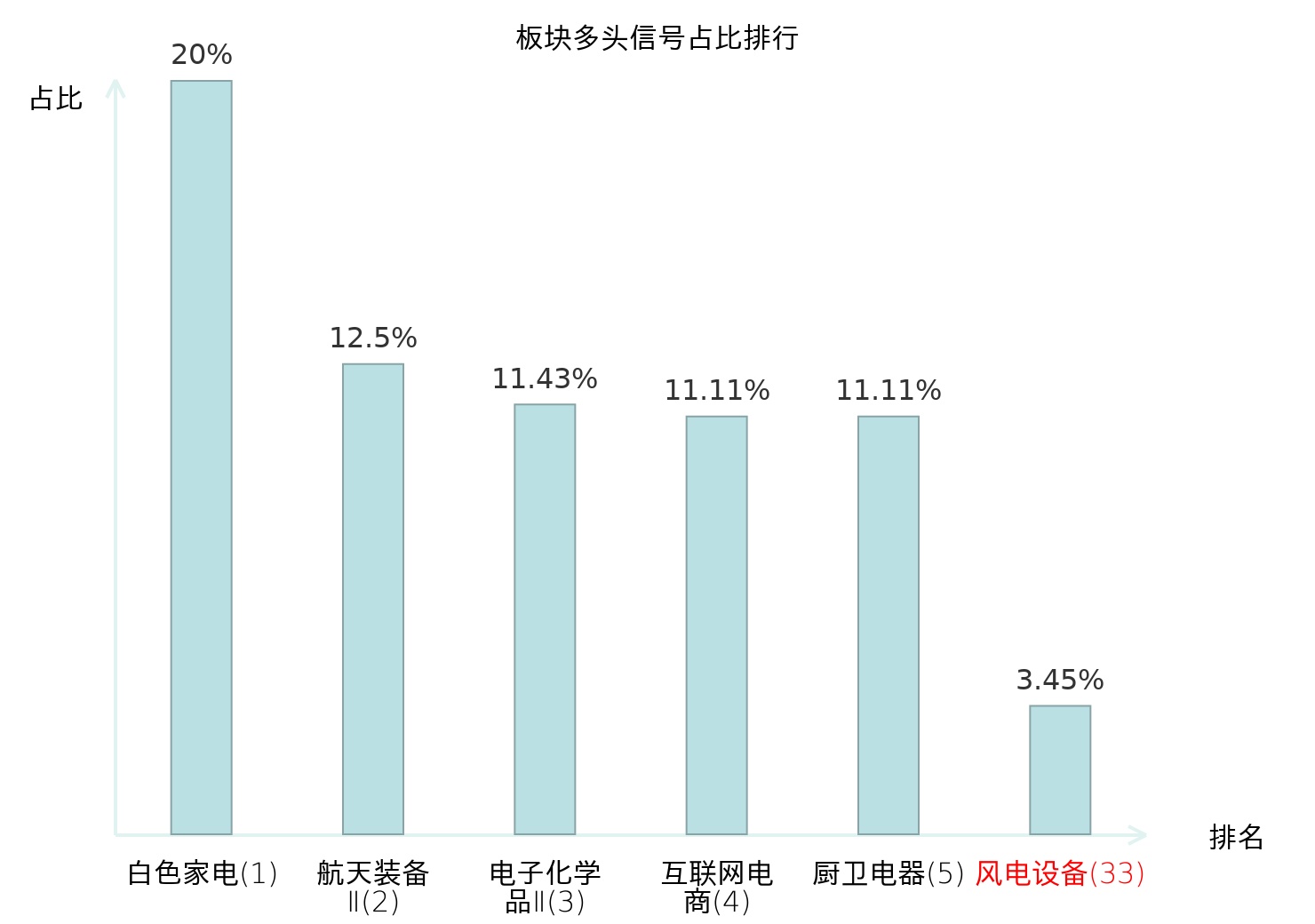 全市场所有行业板块中主力多头信号占比排名中,白色家电板块位居第一。航天装备Ⅱ板块名次提升最快,较昨日上升118位。