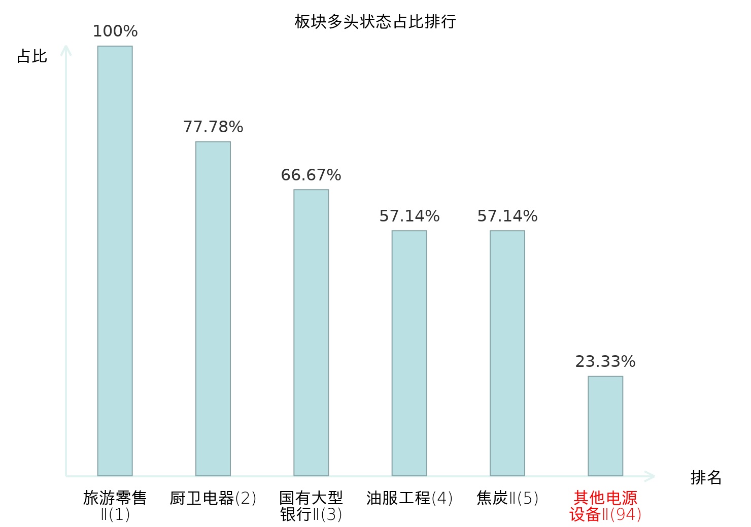 全市场所有行业板块中主力多头状态占比排名中,旅游零售Ⅱ板块位居第一。房地产服务板块名次提升最快,较昨日上升71位。
