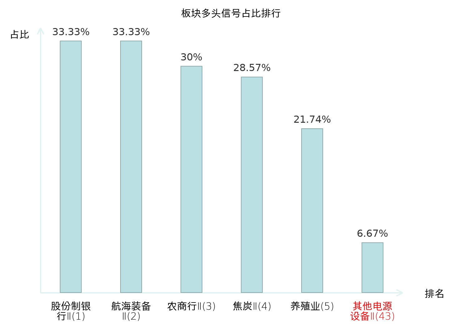 全市场所有行业板块中主力多头信号占比排名中,股份制银行Ⅱ板块位居第一。焦炭Ⅱ板块名次提升最快,较昨日上升119位。