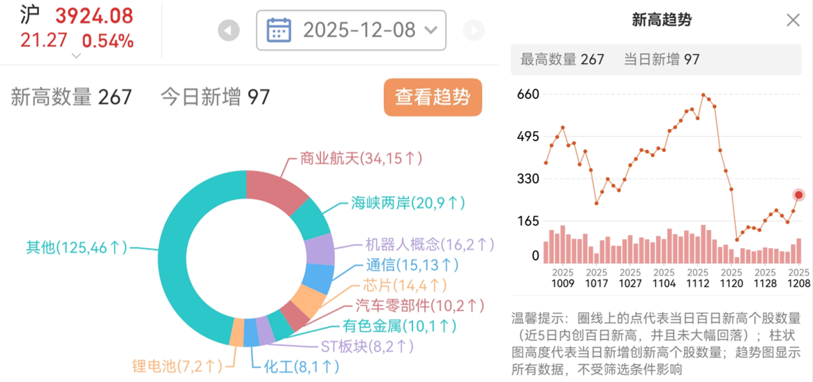 从百日新高去看,板块新高数量前4:商业航天>福建>机器人>通信