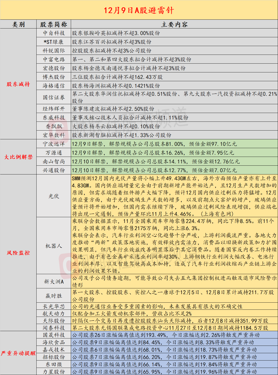 导读:财联社12月9日投资避雷针,近日,A股及海外市场潜在风险事件如下。国内经济信息方面包括:1)国内商品期市夜盘收盘多数下跌,非金属建材跌幅居前;2)机构预计12月国内光伏产量将小幅上升,国内供应过剩压力将猛增;公司方面重点关注包括:1)新大洲A公告,公司及子公司债务逾期,可能导致公司失去五九集团控制权进而触及退市风险警示情形;2)赢时胜第一大股东、控股股东、实控人之一唐球于12月5日、12月8日累计减持211.7万股公司股份;海外市场重点关注包括:1)美股三大指数集体收跌,特斯拉跌超3%;2)国际清算银行表示,黄金已更大程度上成为投机资产,散户驱动了近期飙升。