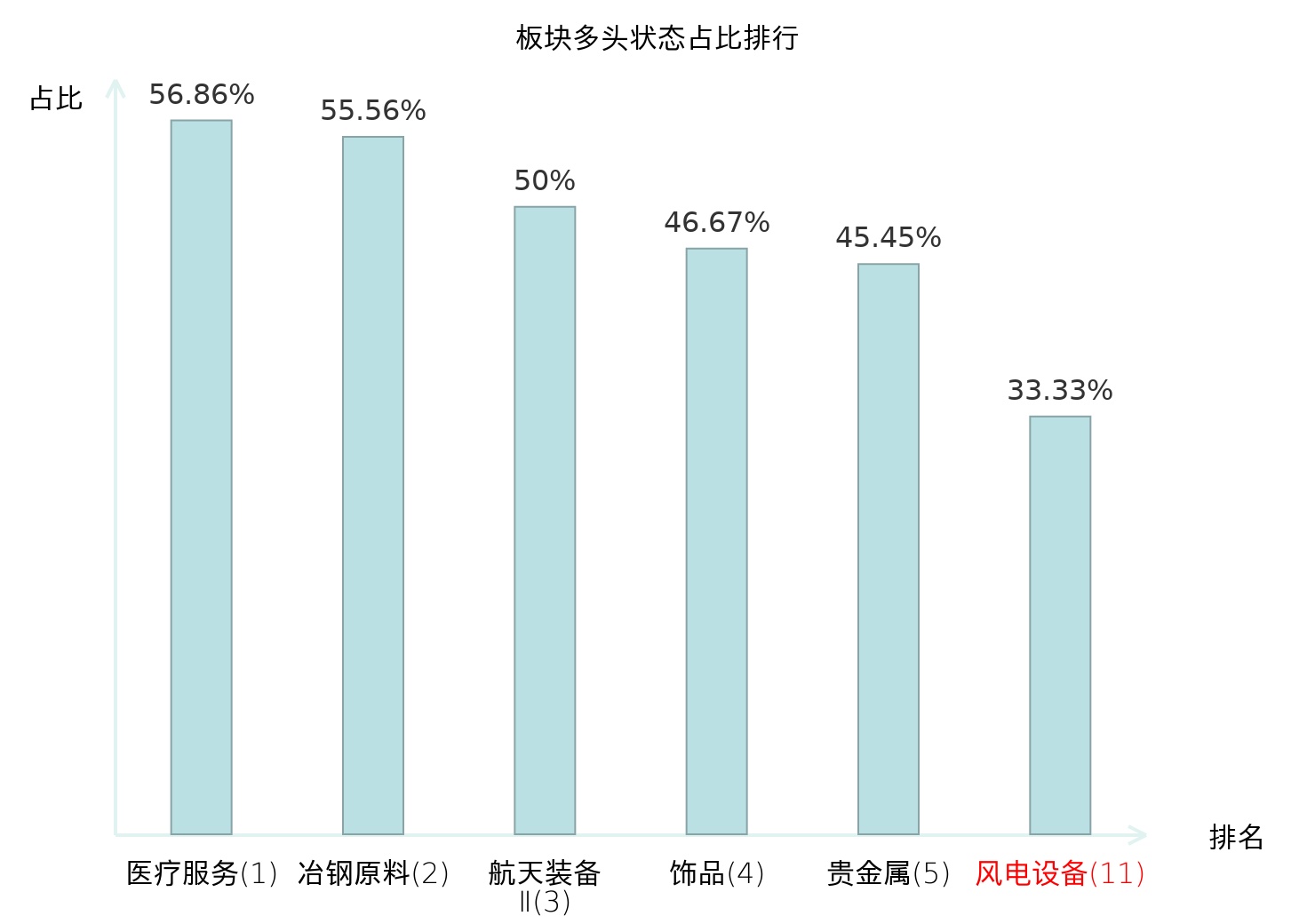 全市场所有行业板块中主力多头状态占比排名中,医疗服务板块位居第一。旅游及景区板块名次提升最快,较昨日上升61位。