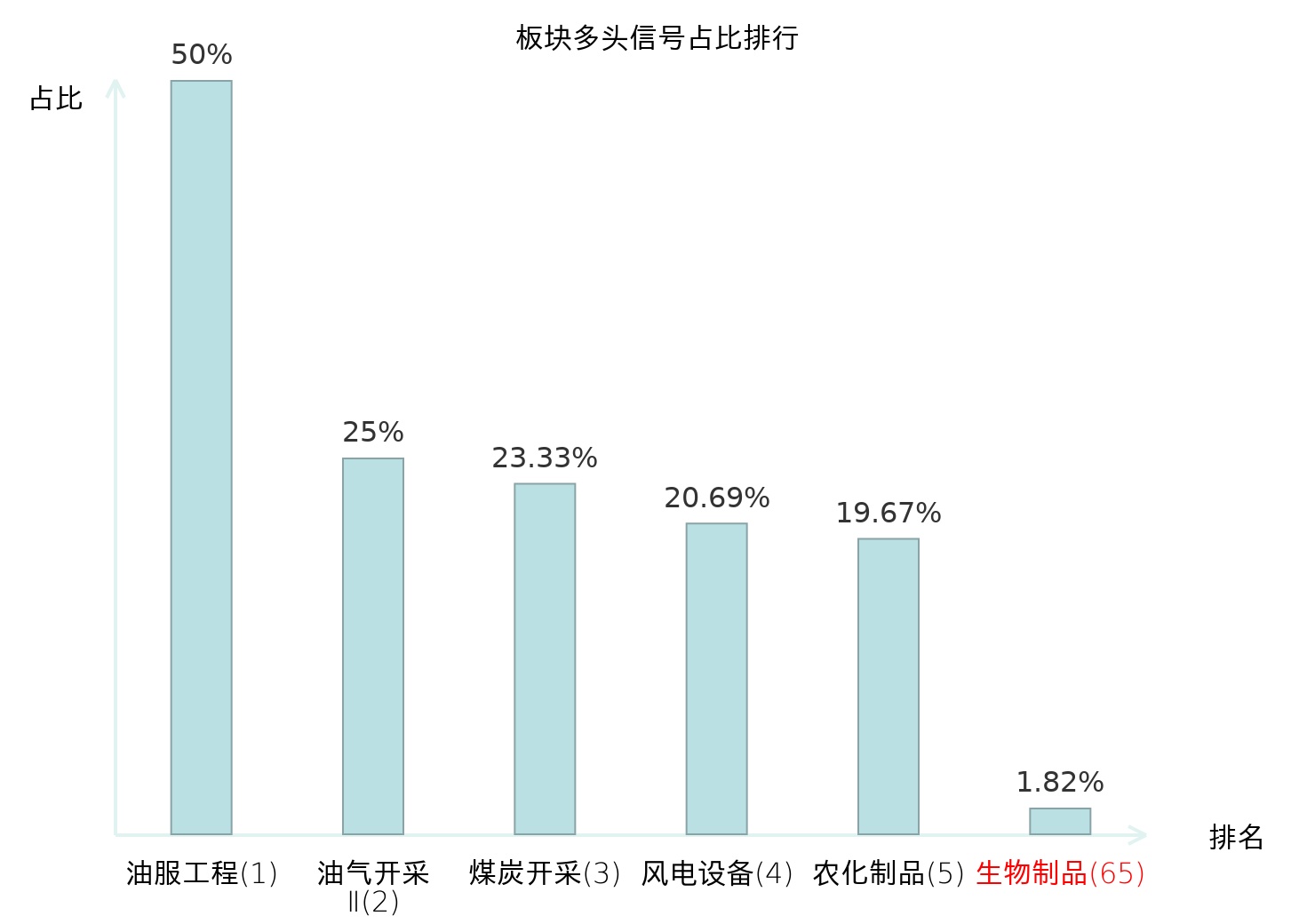 全市场所有行业板块中主力多头信号占比排名中,油服工程板块位居第一。油气开采Ⅱ板块名次提升最快,较昨日上升125位。