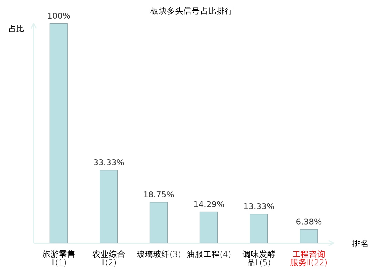 全市场所有行业板块中主力多头信号占比排名中,旅游零售Ⅱ板块位居第一。旅游零售Ⅱ板块名次提升最快,较昨日上升130位。