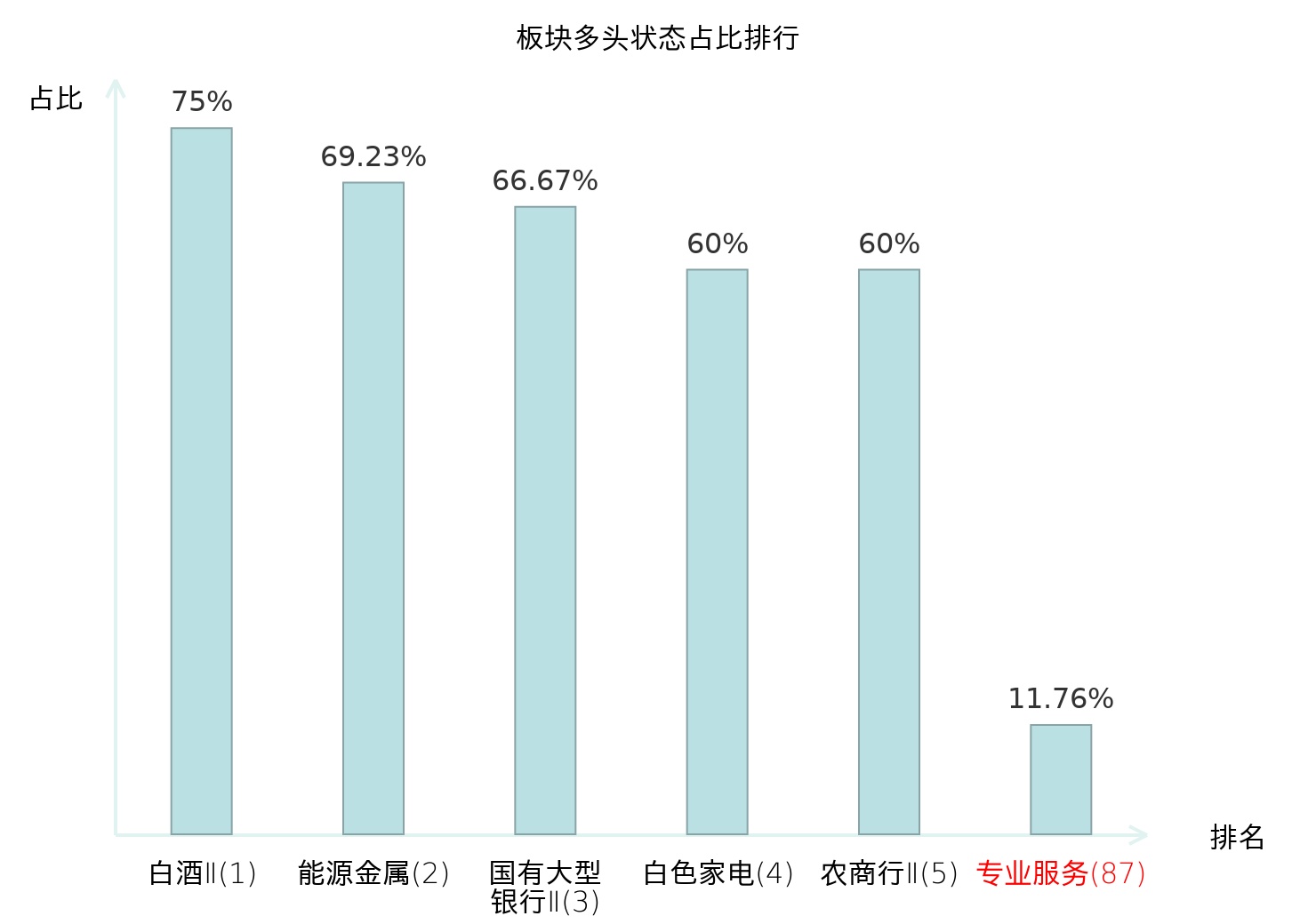 全市场所有行业板块中主力多头状态占比排名中,白酒Ⅱ板块位居第一。房地产服务板块名次提升最快,较昨日上升86位。