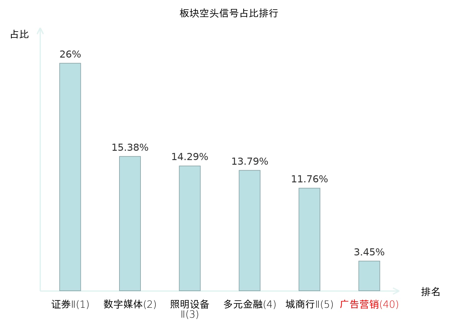 全市场所有行业板块中主力空头信号占比排名中,证券Ⅱ板块位居第一。IT服务Ⅱ板块名次提升最快,较昨日上升118位。