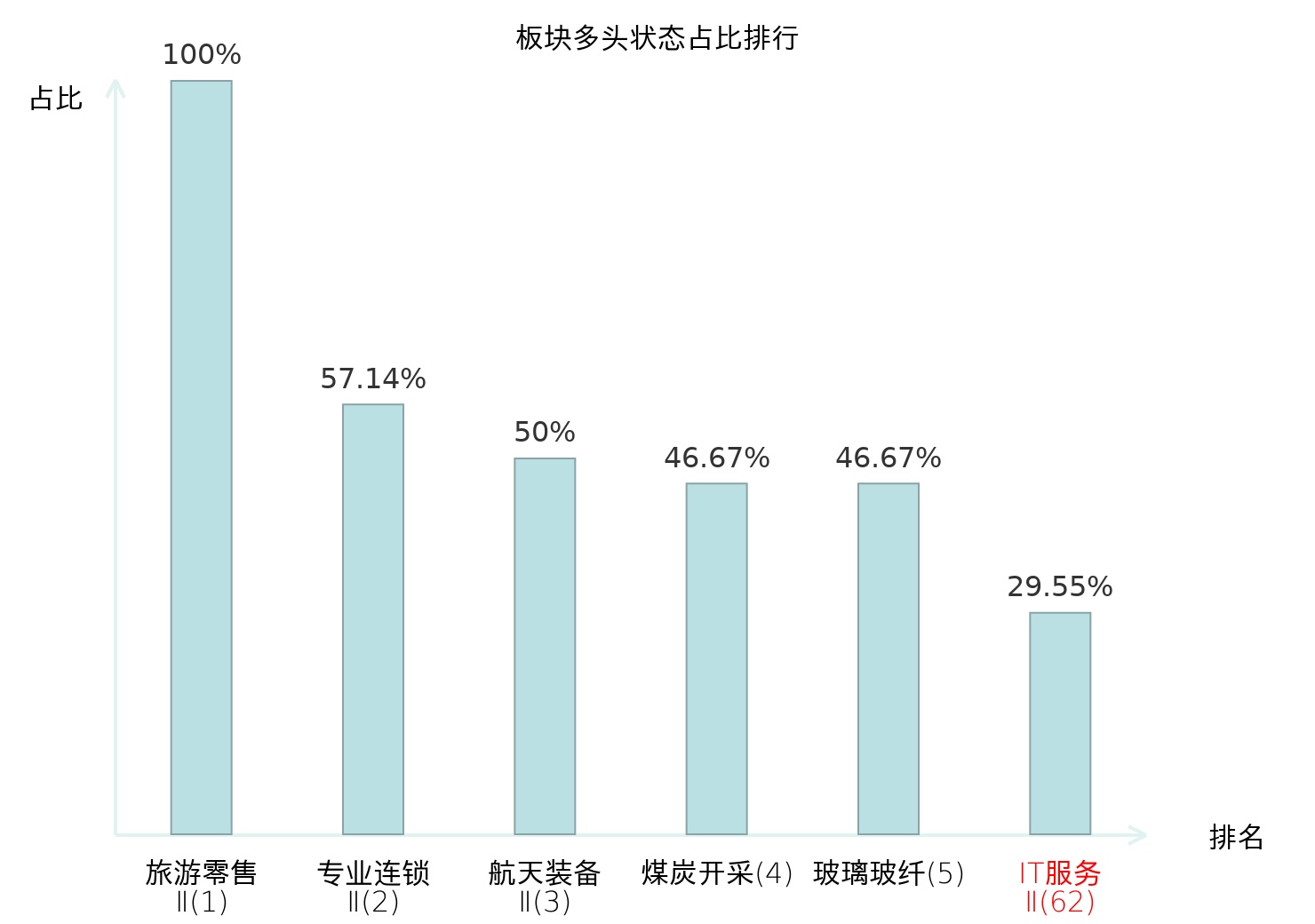全市场所有行业板块中主力多头状态占比排名中,旅游零售Ⅱ板块位居第一。普钢板块名次提升最快,较昨日上升64位。