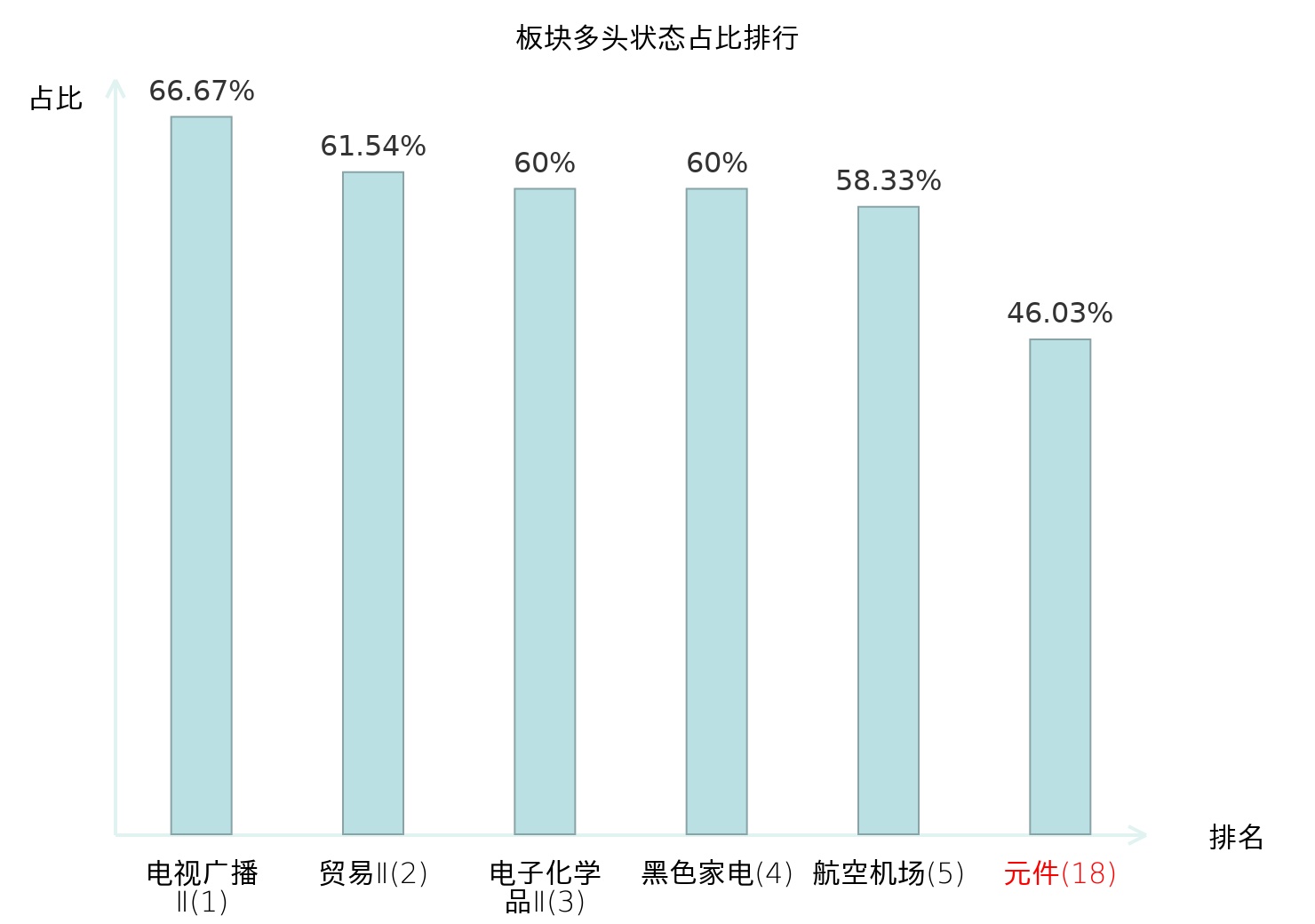 全市场所有行业板块中主力多头状态占比排名中,电视广播Ⅱ板块位居第一。黑色家电板块名次提升最快,较昨日上升80位。