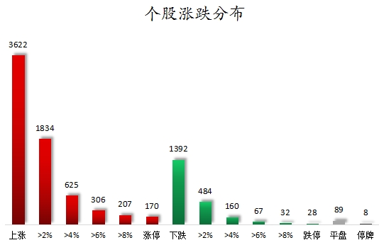 个股涨跌情况,截至收盘,沪深两市合计3622只个股上涨,1392只个股下跌,平盘个股89只,停牌的个股8只。不含当日上市新股,共有170只个股涨停,28只个股跌停。