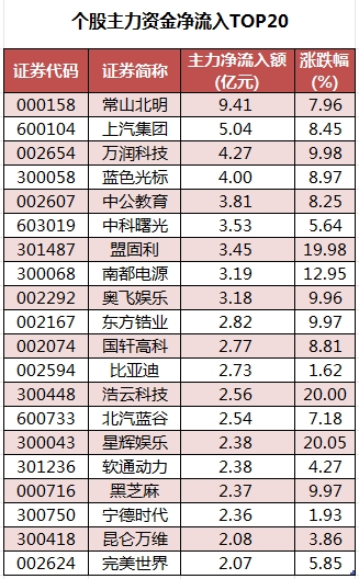 个股来看,今日有1644只个股获主力资金净流入,其中,56股获主力资金净流入超1亿元。常山北明主力资金净流入最多,净流入金额为9.41亿元;主力资金净流入居前的个股还有上汽集团、万润科技、蓝色光标、中公教育、中科曙光,净流入金额分别为5.04亿元、4.27亿元、4亿元、3.81亿元、3.53亿元。