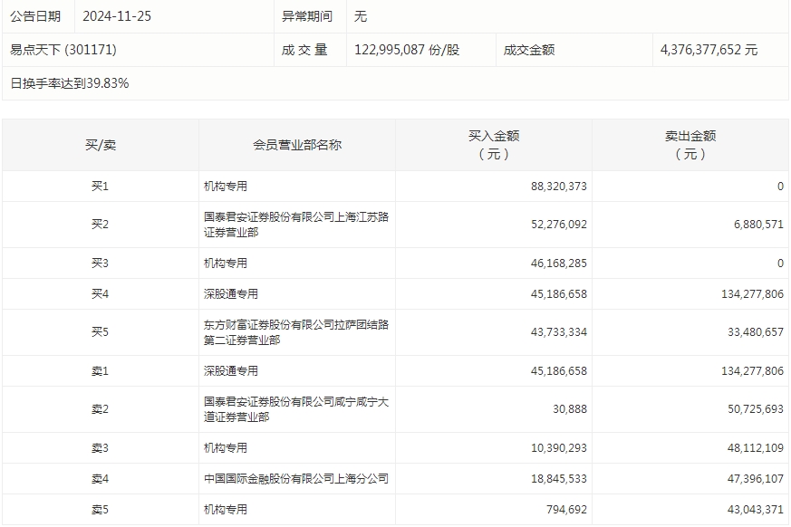 易点天下今天涨6.04%。盘后数据显示,4家机构出现在龙虎榜单上,合计净买入5451.82万元;国泰君安证券股份有限公司上海江苏路证券营业部买入5227.61万元,同时卖出688.06万元;中国国际金融股份有限公司上海分公司买入1884.55万元,同时卖出4739.61万元。