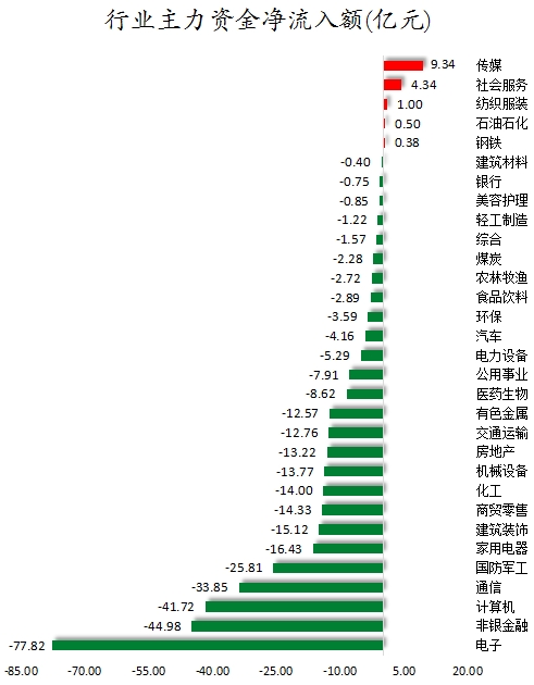 从行业来看,申万所属的31个一级行业,今日有5个行业主力资金呈现净流入,其中,传媒行业主力资金净流入最多,净流入金额为9.34亿元;行业主力资金净流入居前的还有社会服务、纺织服装,净流入金额分别为4.34亿元、1亿元。26个行业主力资金呈现净流出,其中,电子行业主力资金净流出最多,净流出金额为77.82亿元;行业主力资金净流出靠前的还有非银金融、计算机、通信、国防军工、家用电器,净流出金额分别为44.98亿元、41.72亿元、33.85亿元、25.81亿元、16.43亿元。