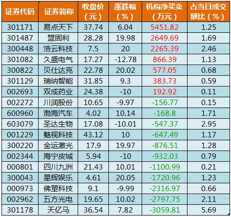 盘后龙虎榜数据显示,今日机构席位资金合计净卖出约1938.46万元。其中,净买入的个股7只,净卖出的个股11只。机构净买入最多的股票是易点天下,净买入金额约5451.82万元;机构净买入居前的还有盟固利、浩云科技等股。机构净卖出最多的股票是天亿马,净卖出金额约3059.81万元;机构净卖出居前的还有五方光电、佛塑科技、星辉娱乐等股。