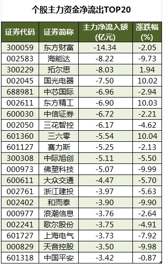 今日有3456只个股被主力资金净卖出,其中,117股被主力资金净卖出超1亿元。主力资金净流出最多的个股是东方财富,净流出金额为14.34亿元;主力资金净流出居前的个股还有海能达、拓尔思、国光电器、中芯国际、东方精工,净流出金额分别为8.22亿元、8.03亿元、7.5亿元、6.96亿元、6.9亿元。