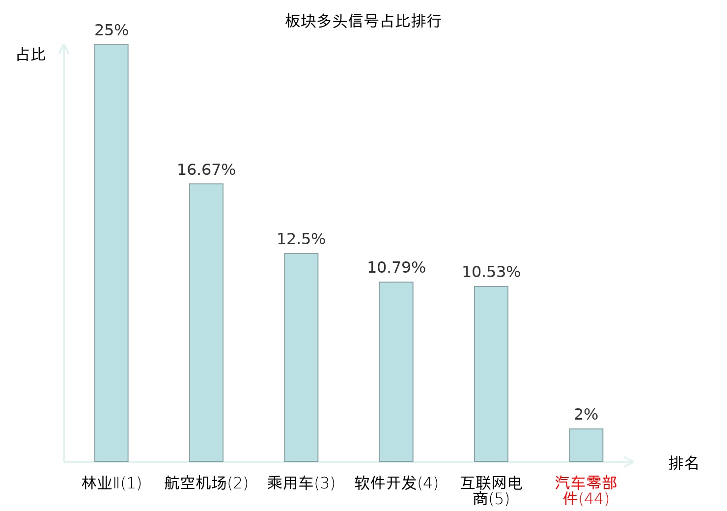 全市场所有行业板块中主力多头信号占比排名中,林业Ⅱ板块位居第一。林业Ⅱ板块名次提升最快,较昨日上升125位。