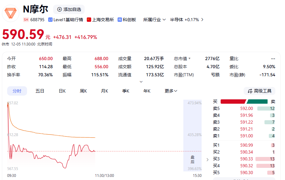 摩尔线程今日登陆科创板,开盘即大幅冲高,一度涨超500%。截至午间收盘,该股涨416.79%报590.59元/股。若以盘中最高价688元/股计算,该股单签最高盈利超28万元。