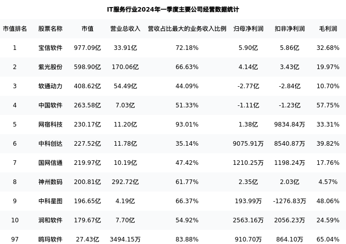 鸥玛软件最新报告期数据为一季度,下表汇总了IT服务行业内市值靠前的公司一季度主要经营数据
