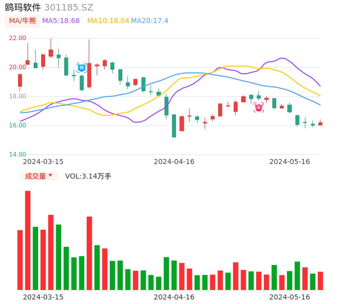 05月16日,鸥玛软件收报16.20,股价涨幅1.19%,成交金额5090.14万元,换手率3.44%。