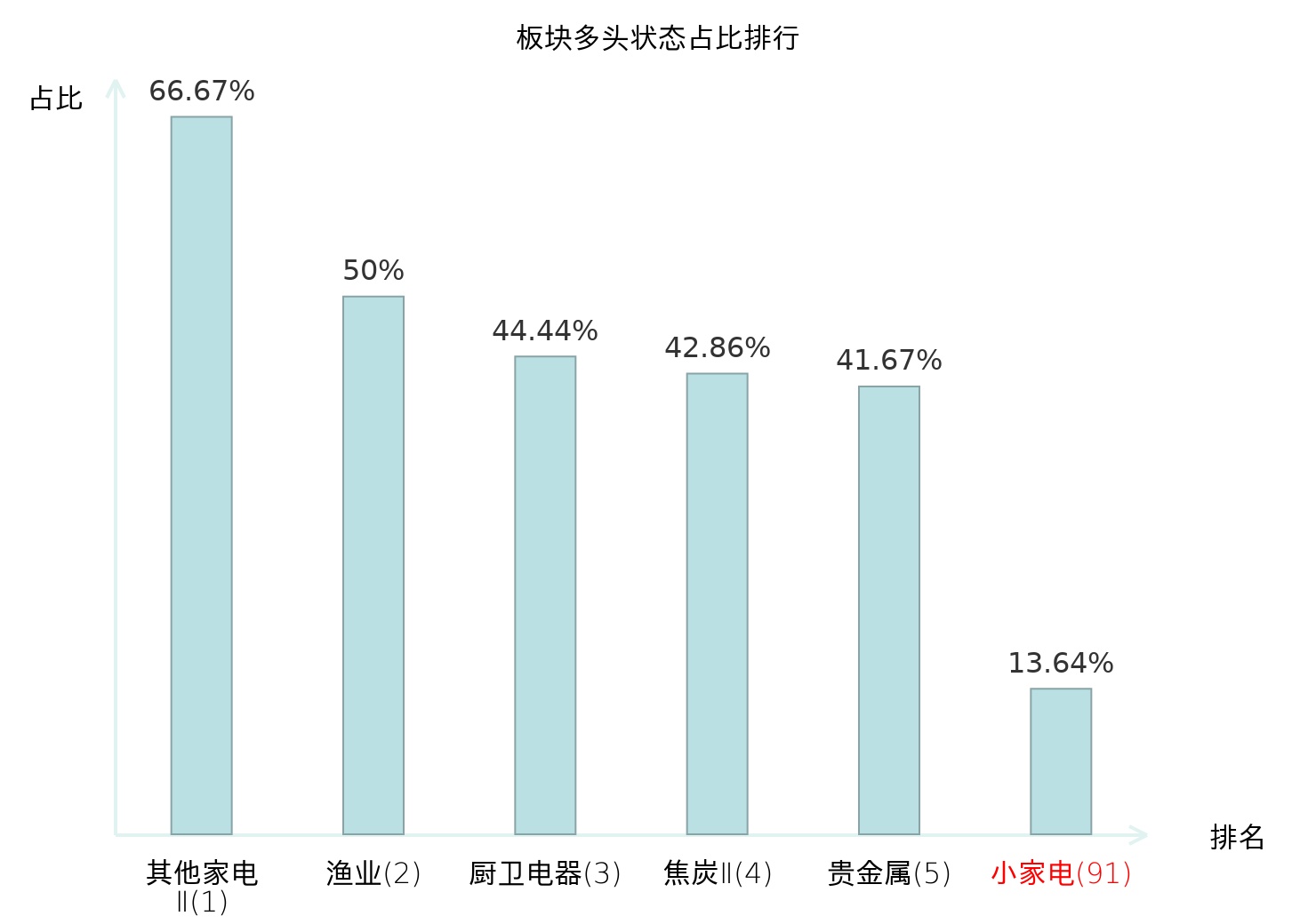 从主力宝信号数据分析,欧圣电气所属的小家电板块中共有3只股票处于主力多头状态,主力多头状态占比在全行业中排名第91位,较昨日下降1位。排名的变化反映了主力对于该板块整体看多意愿的微妙调整。全市场所有行业板块中,其他家电Ⅱ板块的主力多头状态占比最高,位居第一;乘用车板块名次提升最快,较昨日上升82位。这些变动揭示了主力资金在不同行业间的流动趋势,为投资者提供了重要的市场参考信息。