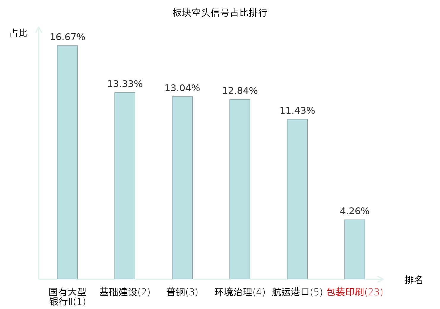 全市场所有行业板块中主力空头信号占比排名中,国有大型银行Ⅱ板块位居第一。环境治理板块名次提升最快,较昨日上升123位。