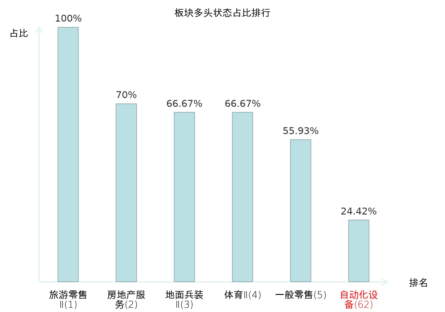 全市场所有行业板块中主力多头状态占比排名中,旅游零售Ⅱ板块位居第一。林业Ⅱ板块名次提升最快,较昨日上升68位。