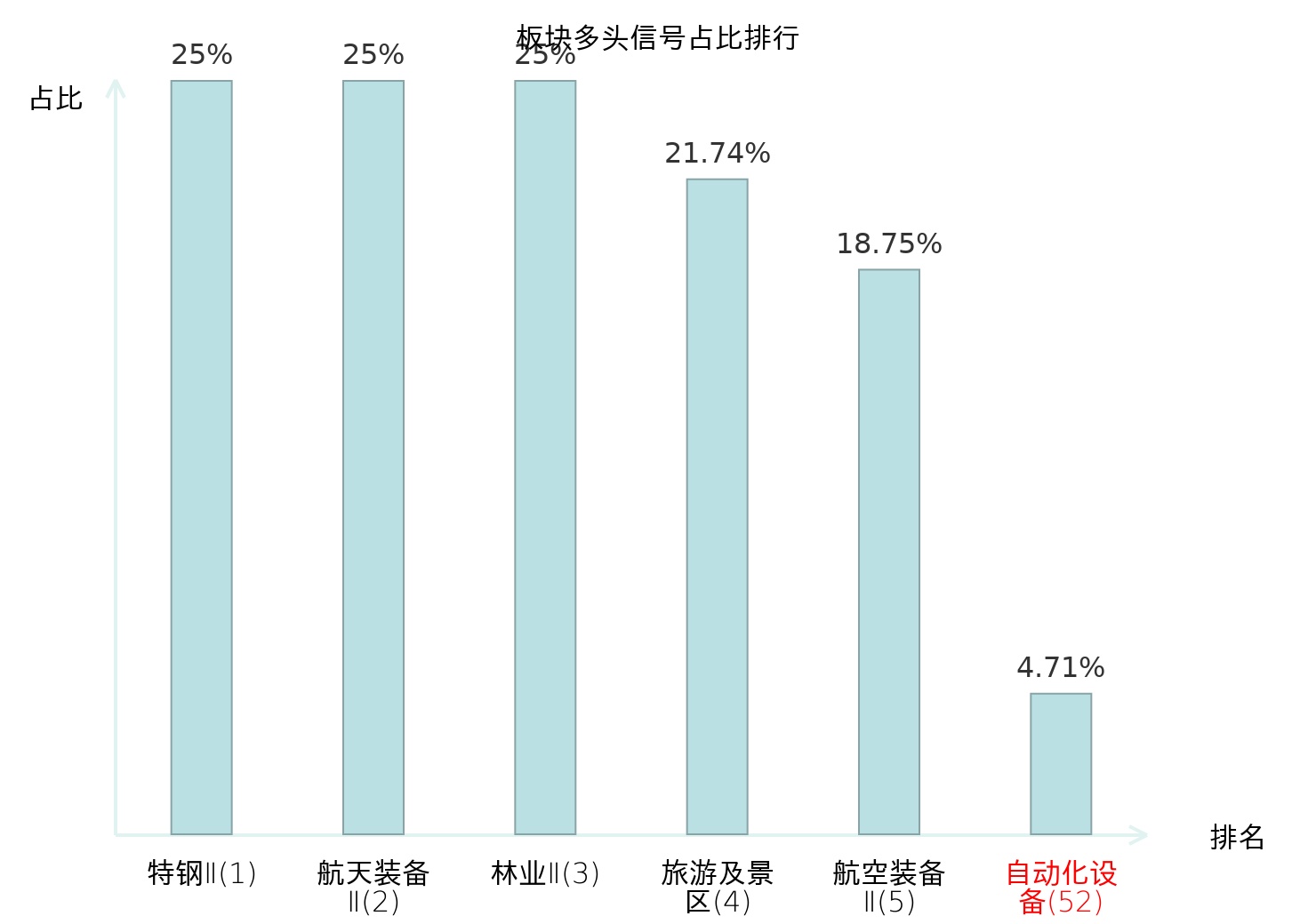 全市场所有行业板块中主力多头信号占比排名中,特钢Ⅱ板块位居第一。林业Ⅱ板块名次提升最快,较昨日上升122位。