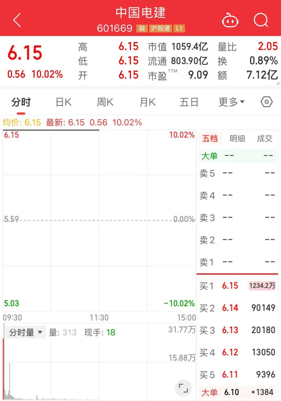 中国电建、华新水泥、中国能建、东方电气等龙头股继续涨停。其中,中国电建(601669)上午收盘涨停板仍有逾1200万手封单,最新市值为1059.4亿元。此外,海螺水泥、恒立液压、特变电工等龙头股大涨。