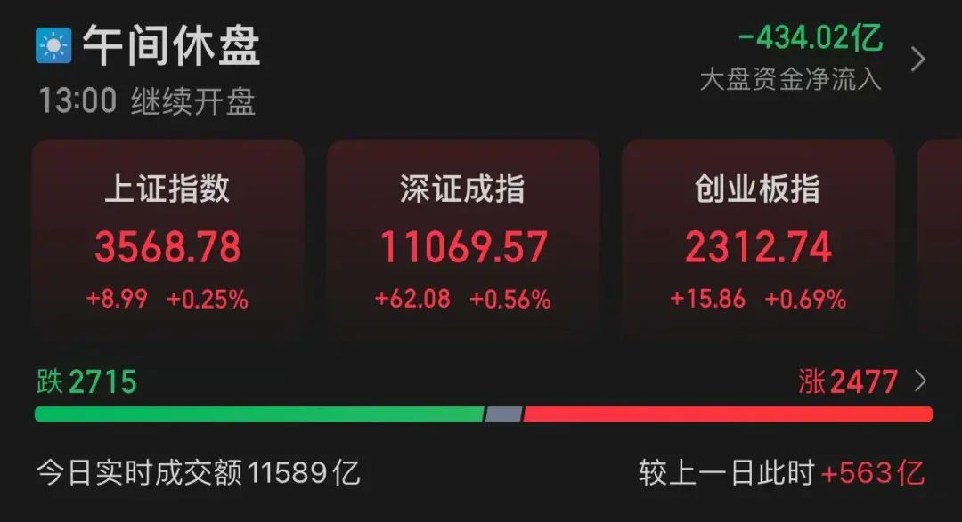 上午收盘,上证指数上涨0.25%,深证成指上涨0.56%,创业板指上涨0.69%。A股半日成交近1.16万亿元。