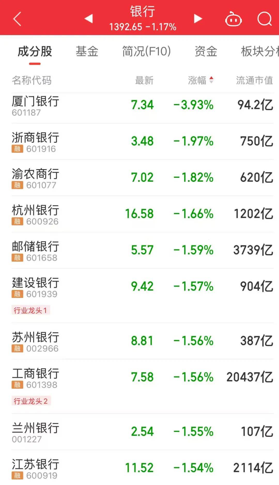 今天上午,大金融板块走弱,银行、券商、多元金融、互联网金融等板块下跌,银行板块跌幅居前。